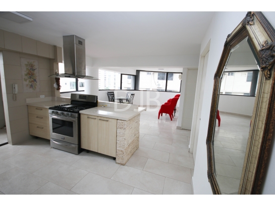 El apartamento se vende con línea blanca: nevera, estufa con horno, extractor, centro de lavado, microondas, calentador de agua, puerta multi-lock, 3 aires acondicionados inverter en sala/comedor y recámaras.